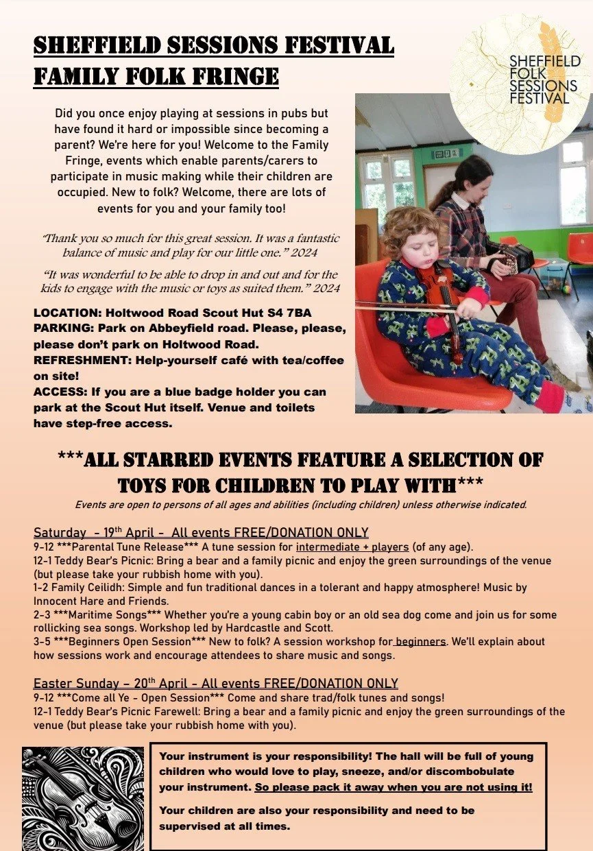 We’re really glad to announce that Chloe and Jake Middleton-Metcalfe have organised the Family Fringe (Baby & Child friendly session) for us again this year for instrumentalists, singers and dancers. Come prepared! Please BYOB and food. Some toys provided but more welcome. Tolerant adult musicians without children also welcome. For more information either click the images below, or check out the Facebook event and let us know if you’re coming [Here]